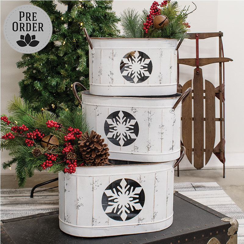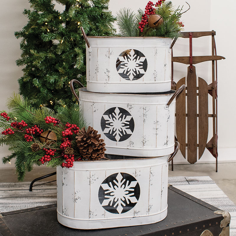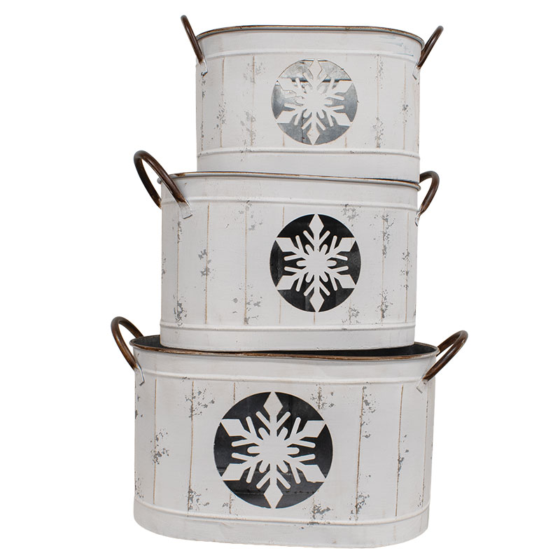 Minimum quantity for "3/Set - Distressed White Snowflake Oval Metal Buckets" is 1.