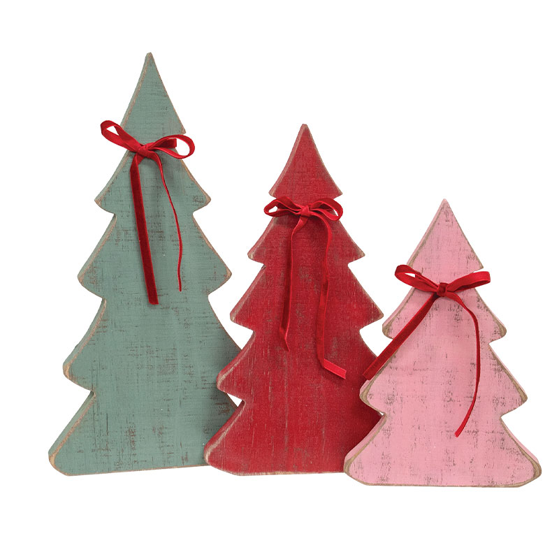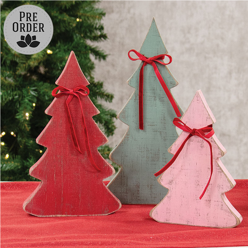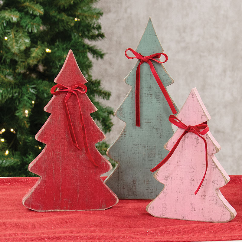 Bring warm, rustic charm to Christmas and Winter displays with the Rustic Wood Christmas Tree Sitters. This set of three wooden trees features a chunky carved design with distressed paint and worn edges, adding a cozy, weathered touch to seasonal decor. Each tree stands easily on its own with a .75" depth, creating a lovely tiered look when grouped together. The small tree comes in a soft pink and measures 8" high by 5.5" wide. The medium tree is painted a festive red and measures 10" high by 6" wide. The large tree features a muted gray finish and measures 12" high by 6.5" wide. Perfect for pairing with classic holiday signs or tucking into wintry mantel and tabletop displays, this set brings a timeless feel to any space.