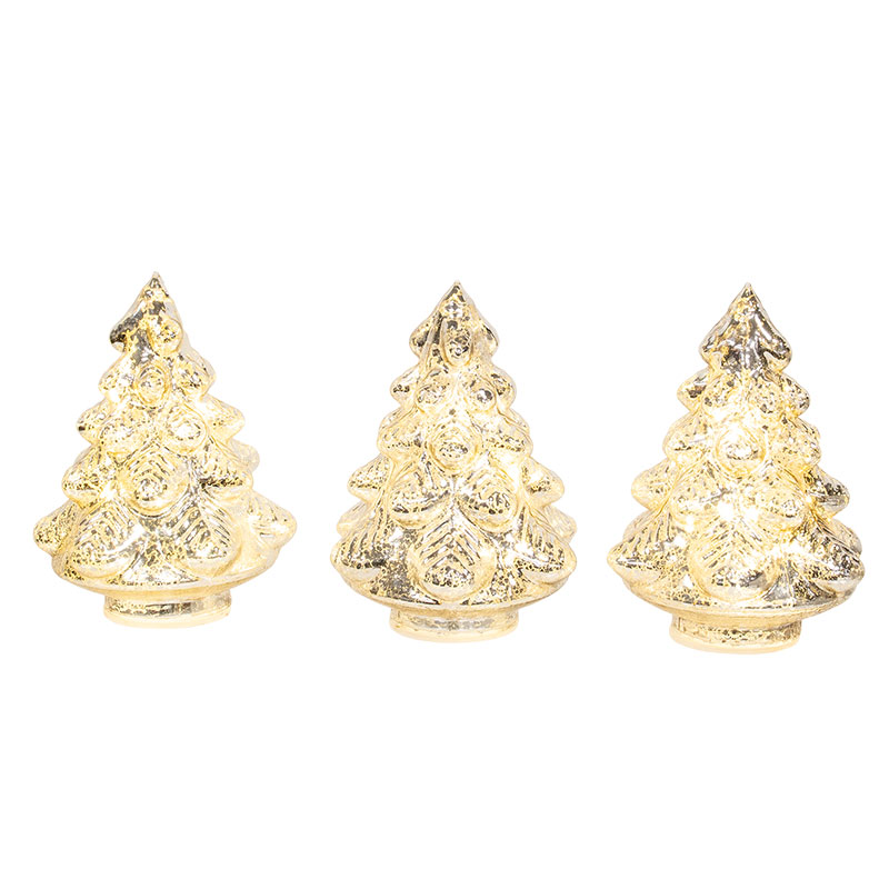 Add a timeless, vintage-inspired glow to winter decor with the Silver Mercury Glass LED Christmas Trees. Beautifully sculpted with a classic tree silhouette, each piece features textured branches and a rounded base. The silvery mercury glass finish offers a softly reflective, irregular two-tone effect that enhances the charming design of the trees. Warm LED lights illuminate each tree from within, creating a cozy festive ambiance. Powered by included CR2032 batteries, these decorative accents complete Christmas shelf, mantel, or tabletop displays. Each tree measures 5" high and 4" in diameter.