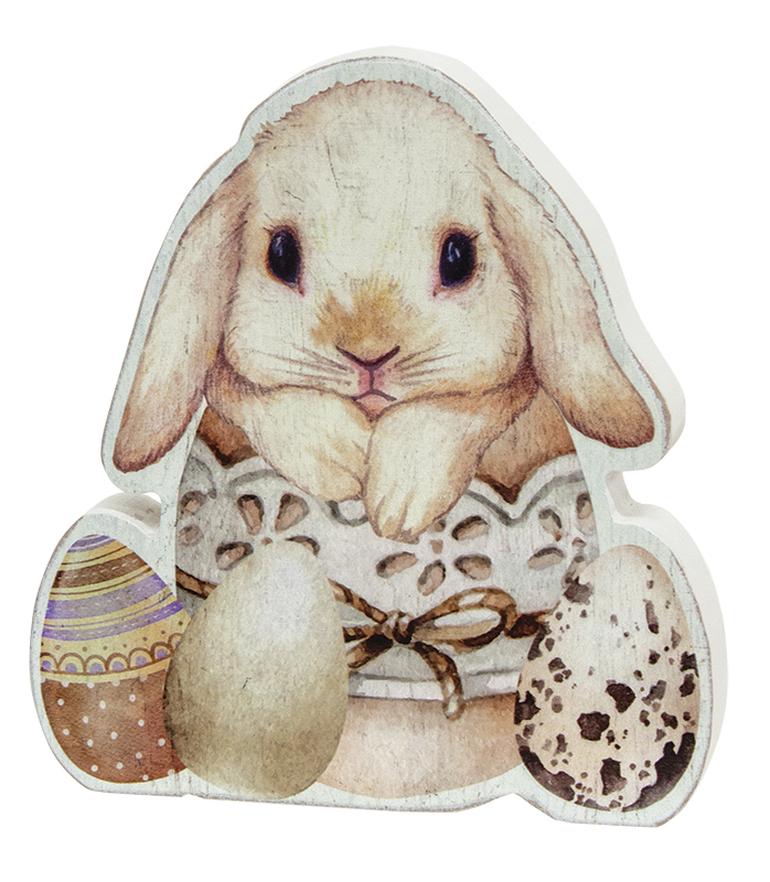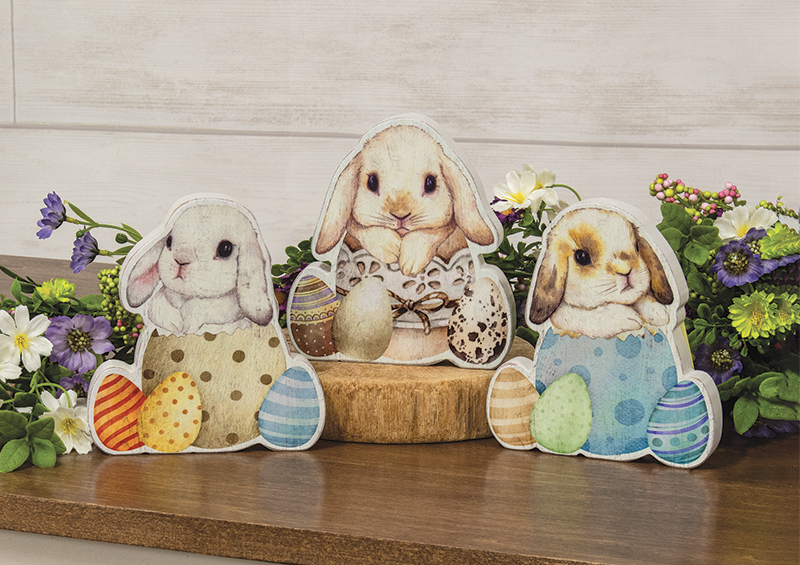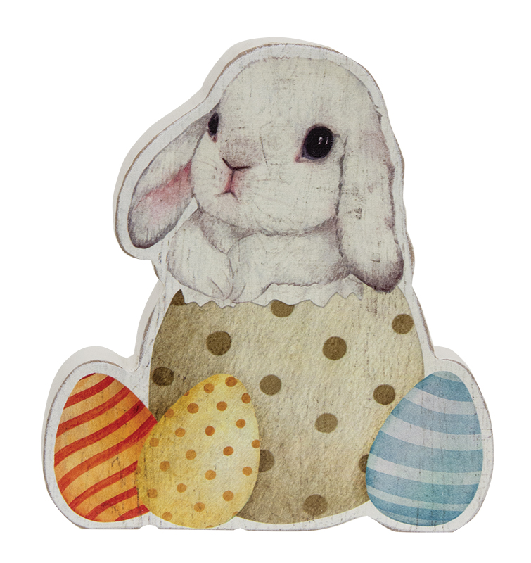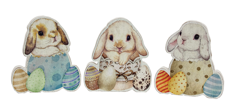 The Chunky Hatching Baby Easter Bunny Sitter assortment will make Easter displays ear-resistible! These cutout wooden sitters measure 5.5" high by 5" wide by .75" deep and feature vintage watercolor designs with moderate distressing. Each depicts smaller Easter eggs surrounding a large egg with a darling baby bunny hatchling. A white bunny with brown spots emerges from a blue spotted egg with accenting eggs in blues, greens, and brown. A lacy brown egg with a bow holds a creamy colored bunny and is surrounded by brown and natural toned eggs. Lastly, a white bunny with accenting smaller eggs in red, yellow and blue hatches from a gray polkadot egg. These heart-melting sitters pair well with a rustic basket filled with flowers and colorful eggs and bring cuteness and vintage vibes to a range of Easter displays.