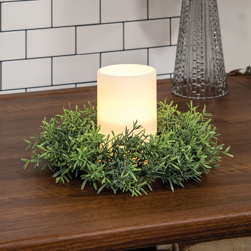The Dusty Rosemary Candle Ring offers an old-fashioned farmhouse touch. This candle ring features dense branches of green plastic rosemary leaves on a green base. The leaves are light at the tips and deeper green near the base, with a realistic, dusty finish. This ring looks charming displayed with a pillar or votive candle, or hanging as a miniature wreath during the spring. Measures 4" inside dia by around 9" outside diameter.