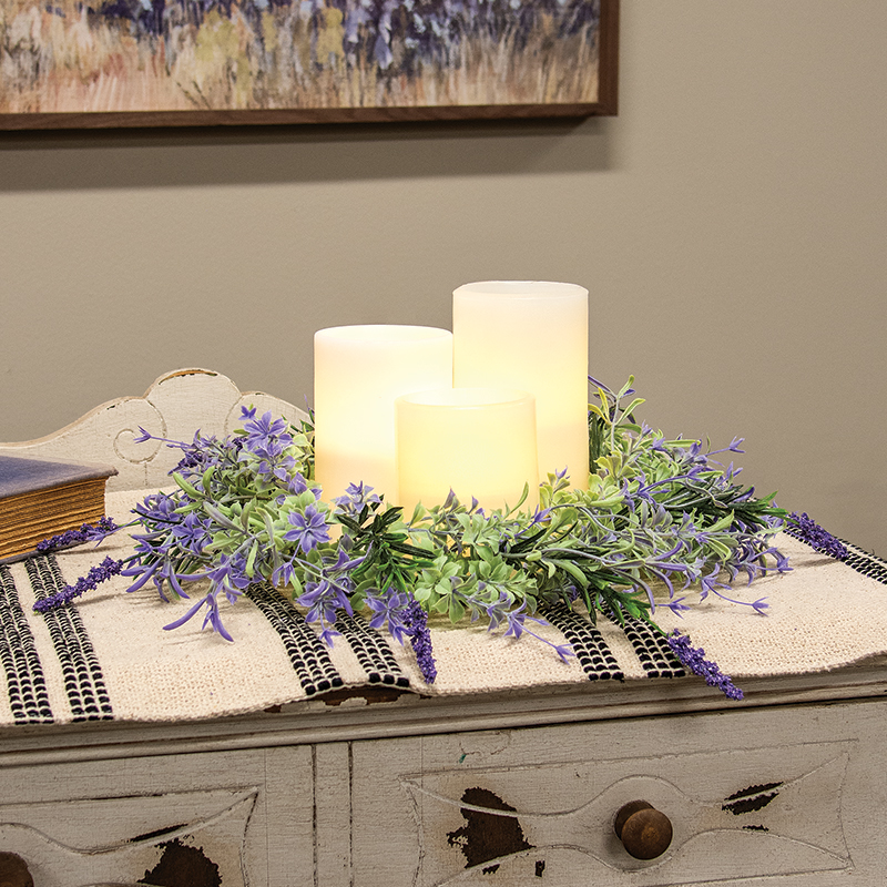 Our Golden Trumpet & Lavender Candle Ring fills out springtime or everyday displays with a fresh, realistic look. Starting with a thick green stem, the ring features green branches and a variety of green leaves. Golden trumpet blooms with a purple hue add color to the ring, while sprigs of lavender offer added volume and texture. Measuring 6.5" in inner diameter and 15" in outer diameter, this ring looks perfect placed around a candle, vase, or other decor.
