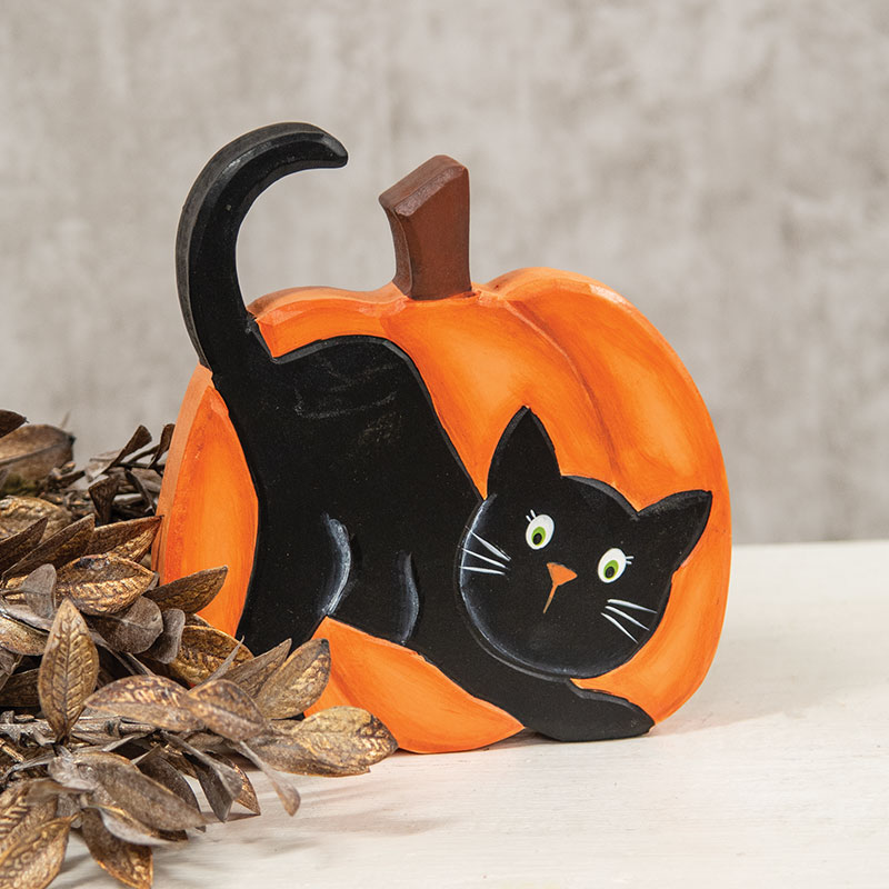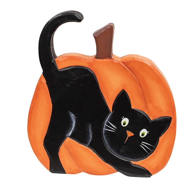 Bring whimsical charm to Halloween displays with the Hand Carved Wooden Black Cat Pumpkin Sitter. This wooden accent features an orange pumpkin with a black cat shown on the front. The cat’s bright green eyes, orange triangle nose, and white whiskers add a friendly look to spooky seasonal decor. Tuck this sitter into tiered trays, pair it with spooky signs, or add it to any Halloween vignette for an instant dose of character. Measures 7" high by 6.25" wide by 1" deep.