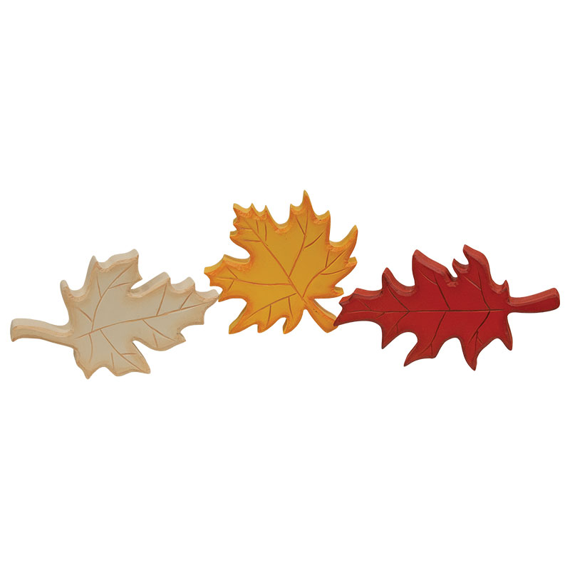 Bring the beauty of fall to farmhouse displays with our Hand Carved Wooden Fall Leaf Sitters. This set of three wooden leaf sitters features chunky carved shapes, etched veins, and warm, dimensional finishes for a nature inspired look. Each leaf has a unique shape and seasonal color, with the yellow leaf measuring 5.25" high by 6" wide, the red leaf measuring 4.5' high by 8" wide, and the white leaf measuring 4.25" high by 7.25" wide. The freestanding leaves each have a sturdy 1" depth and accent Autumn decor whether displayed individually or arranged together.