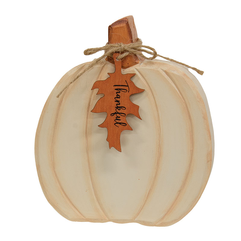 Add a seasonal accent to fall farmhouse display with the Hand Carved Wooden Thankful Pumpkin Sitter. This wooden sitter features a chunky carved shape and a dimensional white finish. Defined ribs and a light brown stem give the pumpkin a more natural look, and a flat bottom allows for freestanding display. A cutout leaf accents the pumpkin, tied with a jute string and adorned with text that reads, "thankful." Measures 6.75" high by 5.75" wide by 1" deep.