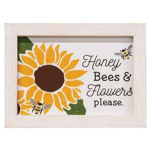 Add a lovely addition to the ever-popular bees and sunflowers theme with the Honey Bees & Flowers Please Sunflower Round Metal Sign. This round metal sign features a black and gold bee in the center framed in sprays of yellow, black and green sunflowers. The phrase "Honey Bees & Flowers Please" frames the fuzzy-looking bee in black text with simple spiral embellishments. This sign would make a beautiful focal piece when surrounded by black and white décor or other bee and sunflower items. It includes a keyhole hanger and measures 14.5" in diameter with a 1" depth.