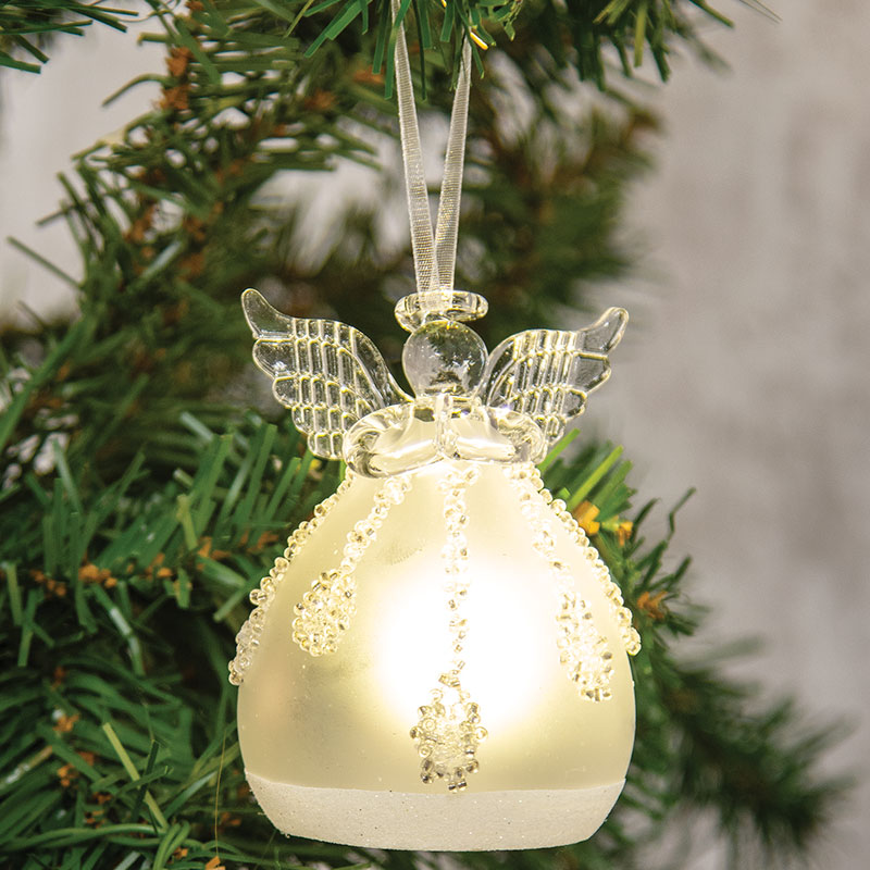 Add a luminous touch to holiday decor with the LED Glass Angel Ornament. Beautifully crafted from glass with a softly rounded silhouette, this elegant piece depicts an angel dressed in a gown, complete with a halo, wings, and defined arms. Translucent jewel-like accents adorn her dress, adding subtle sparkle. A warm white LED light glows from within, creating inviting ambiance. Powered by three included AG13 batteries and finished with a white ribbon loop for hanging, this ornament is perfect for trees, garlands, or decorative displays. Measures 4" high and 2.75" in diameter.