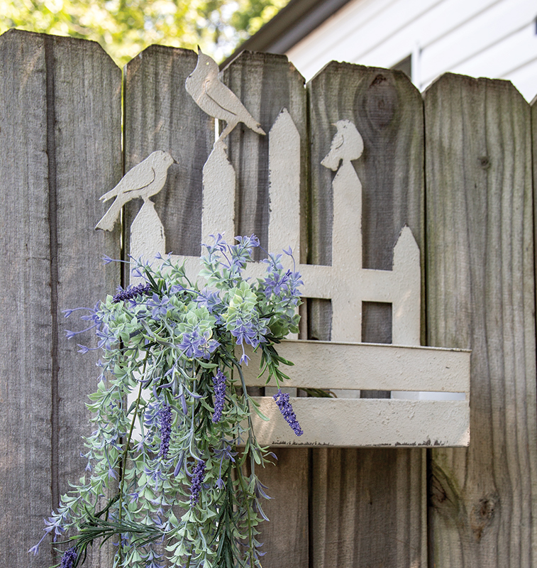 The Metal Fence with Birds Planter lends a shabby-chic touch to any home. This metal planter features a picket-fence inspired design. The front has a horizontal slat opening, while the peaked-back is cut to look like vertical pickets with three birds perched on top. A chippy, textured, off-white finish finishes the look and adds a weathered, vintage effect. This charming planter can be displayed freestanding on a table or shelf, or on a wall using the two keyhole hangers on the back. Add potted plants or faux florals for a rustic accent during spring, summer, or everyday.