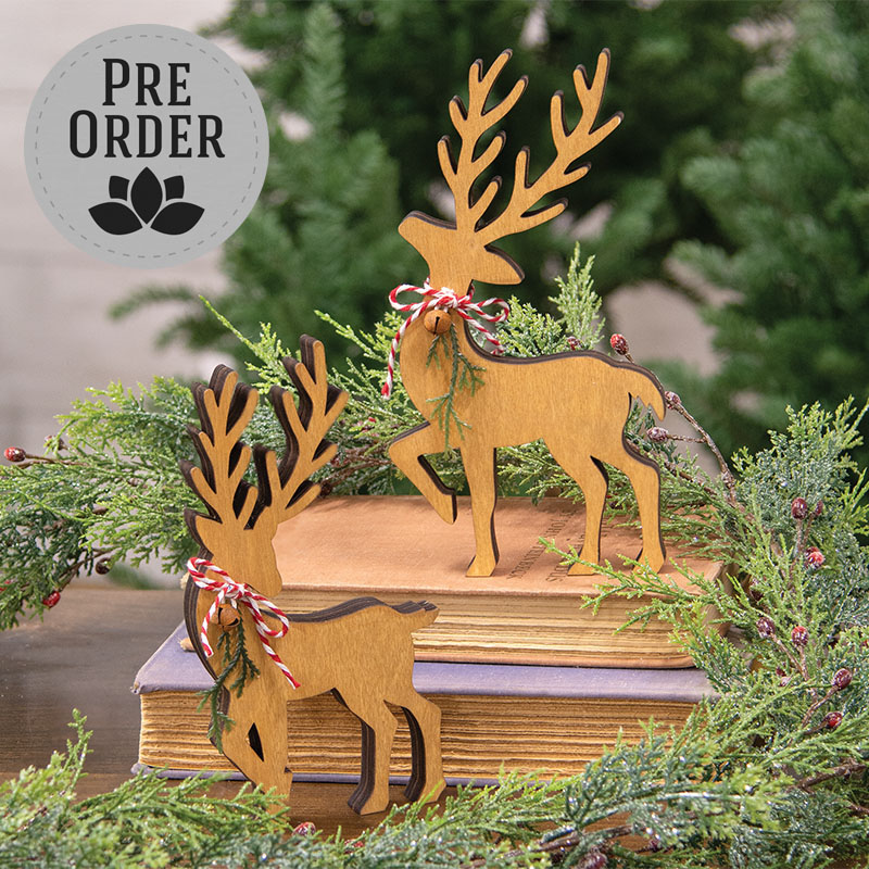 The Natural Wooden Deer Cutout Sitter set will infuse holiday decor with a rustic, woodland charm. This set features two beautifully crafted wooden deer, each captured in a serene walking pose. The larger deer, standing at 8" high, 4" wide, and .75" deep, raises its head to the sky, evoking a quiet strength and majesty. The smaller deer, measuring 7.25" high, 3.75" wide, and .75" deep, looks back over its shoulder in a gentle, inquisitive pose. Both deer boast a warm woodtone finish with darkened edges, which highlights their natural beauty. For a festive touch, each is accented with a red and white string bow at the neck, a small pine sprig, and a rusty metal jingle bell. Add a peaceful, nature-inspired element to the mantel, shelf, or a variety of holiday displays. These sitters bring a cozy, woodland vibe to any space.