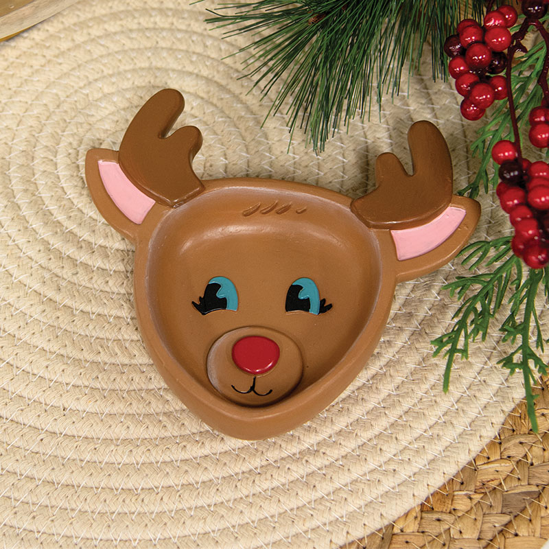 Create a seasonal spot to store jewelry, keys, or small trinkets with the Nostalgic Resin Reindeer Trinket Dish. The dish’s detailed design depicts a reindeer with a warm brown hue. His blue eyes and pink triangle ears give him a friendly look, while antlers and a bright red nose add a familiar touch. The versatile tray measures 1” high by 5.5” wide by 5” deep.
