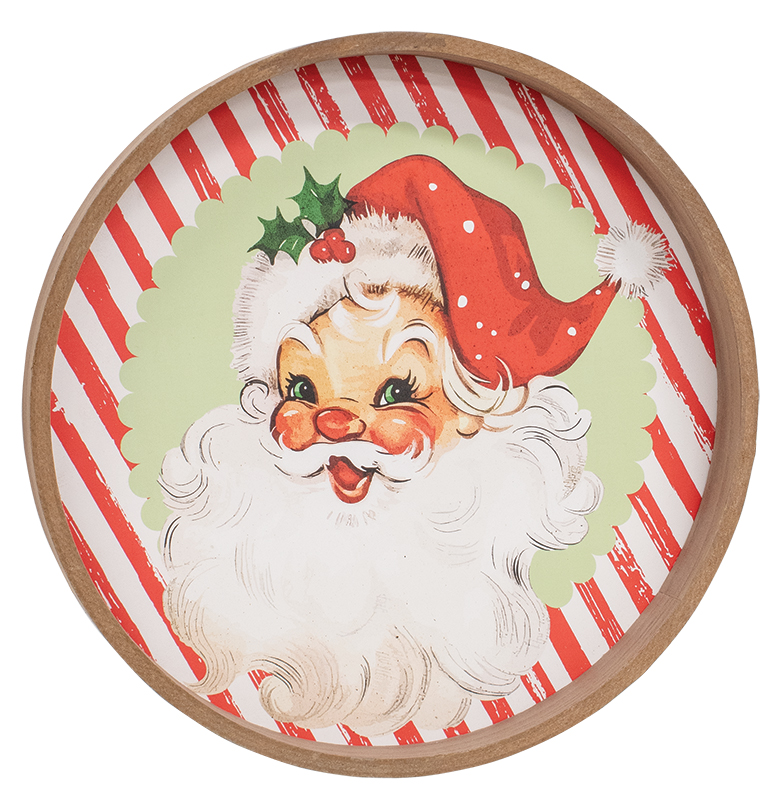 Festive nostalgia takes stage with the Nostalgic Santa Round Wooden Tray. This charming piece features a versatile round shape with a rustic, natural brown rim that adds timeless character to Winter decor. At the center, a smiling retro-style Santa is shown, framed by lively red and white stripes and a light green overlay for a delightfully vintage holiday look. Perfect as a cheerful centerpiece or for accenting Christmas tabletop displays, this tray brings a cozy, joyful spirit to any setting. Measures 1.25" high and 11.75" in diameter.