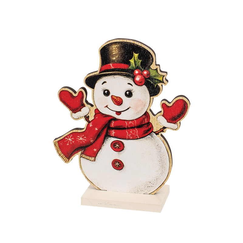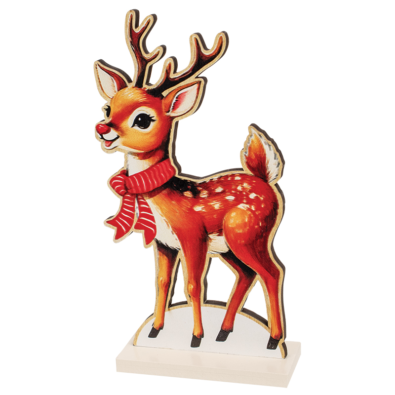 Celebrate whimsical vintage inspired charm with the Nostalgic Winter Wooden Friends on Base set. These assorted wooden sitters feature retro-style cutout illustrations, each perched on a white base for easy, cheerful display. The smiling reindeer wears a bright red scarf and stands 9" high by 4.25" wide. The tall snowman, dressed in a black top hat and red scarf, measures 8.5" high by 4.25" wide. The adorable baby snowman sports a black hat, red scarf, and matching mittens, measuring 7" high by 5.5" wide. Each piece has a sturdy 2" depth at the base. Display them together to create a sweet Winter scene or scatter them throughout holiday decor for pops of nostalgic design!