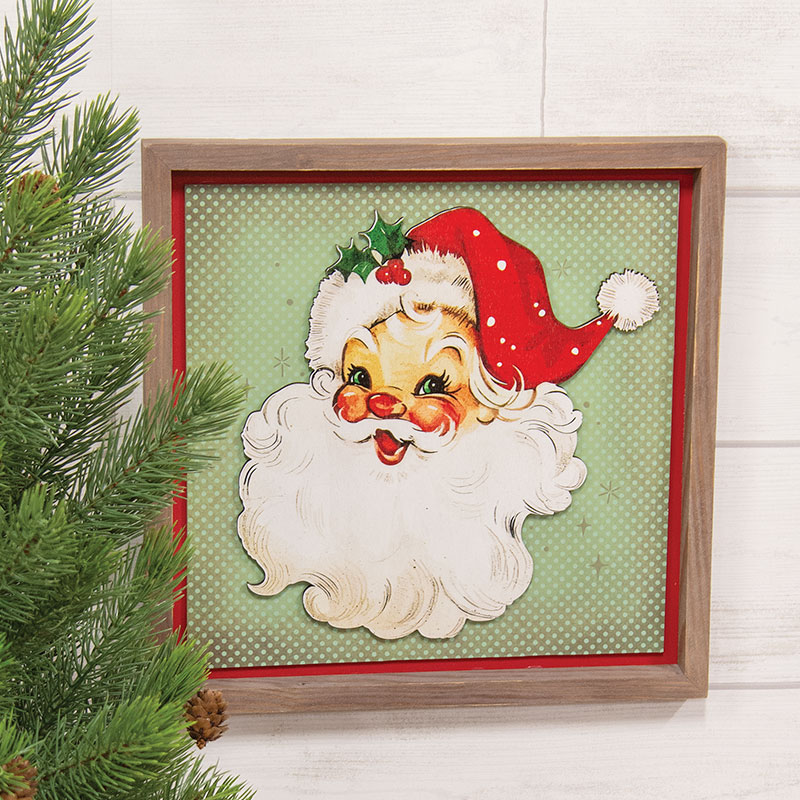 Hang holiday cheer on the wall with the Nostalgic Santa Shadowbox Frame. Set in a wooden frame with a medium brown finish and 2 convenient sawtooth hangers, the art piece measures 13.5" high by 13.5" wide by 1" deep. The art piece depicts Santa's smiling face in a vintage inspired style with red, white, green, and beige tones. Santa is shown with his famous white beard and round, rosy cheeks. The light green background adds dimension to the frame, featuring a polka dot pattern with star accents and a red border.