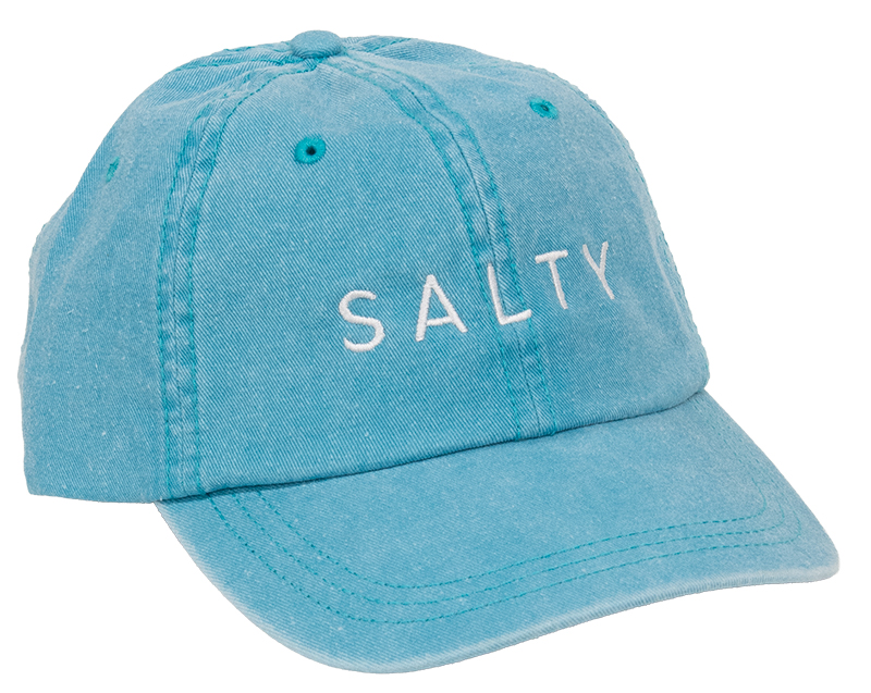 Add a cool, beachy accessory to casual everyday outfits with this Salty Baseball Cap. The unique hat is made from 100% cotton and has a stylish aqua blue color. Embroidered design on the front of the hat reads “salty” in white capitalized letters. An adjustable fabric strap with a metal buckle at the back of the hat allows for easy sizing.