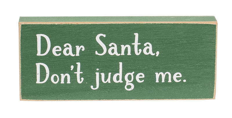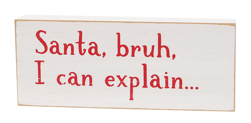 Playful charm completes a festive scene when Santa Bruh Rectangle Blocks are on display. Crafted from wood, each block features a horizontal rectangle shape with a painted finish and rustic distressed edges. A whimsical phrase adorns the front of each block, available in 3 assorted designs. One block is painted red and reads dear Santa, we good?" in white text. One block is white and reads Santa, bruh, I can explain" in red. One is green and reads dear Santa, don't judge me" in white." Measuring 2.5" high by 6" wide by .75" deep, each block stands freely on a flat surface.