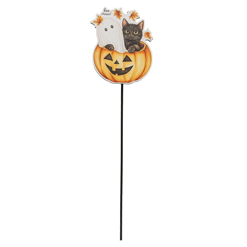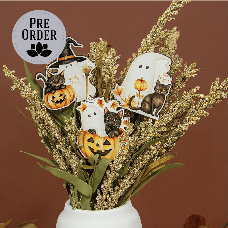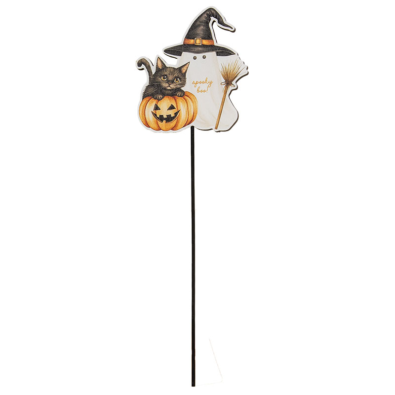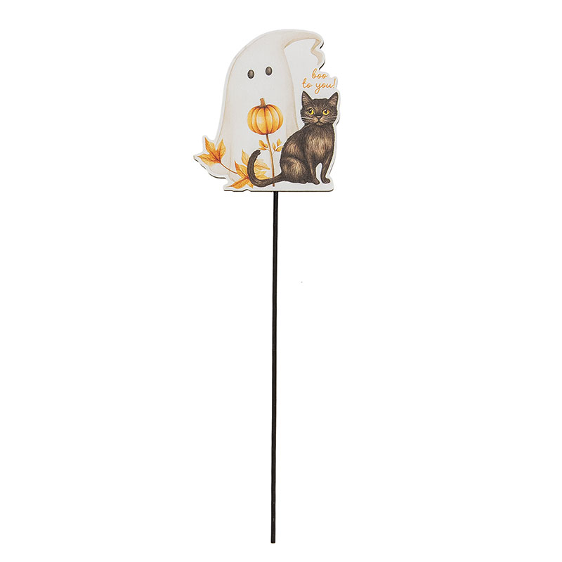 Spooky Boo Wooden Plant Pokes add a playful touch to Halloween decor. This assortment features three wooden plant stakes with each features a whimsical spooky illustration done in soft watercolor-style. One shows a ghost and a black cat alongside the phrase "boo to you!" in orange script. One features a ghost and black cat peeking out from a jack-o-lantern with "boo crew!" in black script . The last plant poke shows a ghost wearing a witch hat and holding a broom beside a black cat sitting a jack-o-lantern; the phrase "spooky boo!" is written in orange script. These plant pokes are perfect for adding festive charm to candy bags, planters and floral displays.