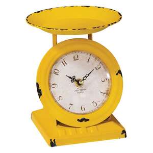 The Vintage Green Old Town Scale Clock will add a lovely vintage feel and sage-colored notes to the farmhouse kitchen. This fun clock features distressed sage finish and the shape and style of an old countertop scale with a working clock in place of the scale face. The clock face has brown numerals and small brown text reading "EST 1863 – Old Town Clocks" on a distressed, white wood grain pattern. In contrast with the rest of the piece, the stylish, black hands of the clock have an ornate design. This clock looks great topped with a candle and florals or greenery for an easy, beautiful display. Measures 6.75" high by 5.5" wide by 5" deep and requires one AA battery (not included.)