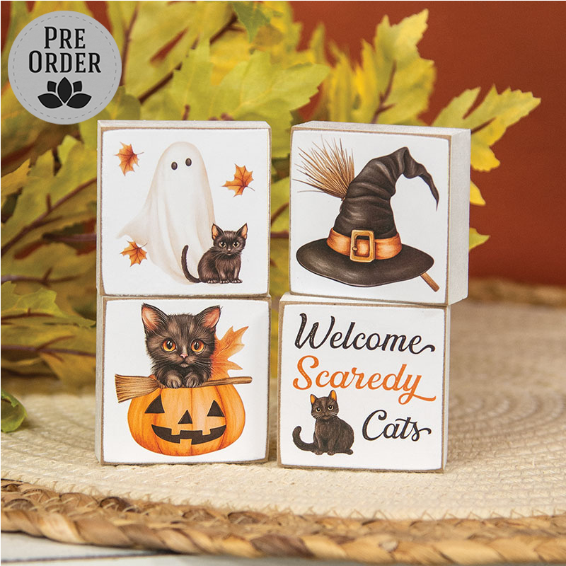 Welcome Scaredy Cat Blocks bring a darling decorative accent to spooky seasonal displays. Each wooden block features a white painted finish with distressed edges for a rustic, farmhouse look. Available in 4 assorted styles, one depicts a sheet ghost with a black kitten, one a black kitten in a jack o lantern, one a witch hat and broom, and one a black kitten and text that reads “welcome scaredy cats.” The square blocks each measure 2” high by 2” wide by .75” deep. Please note: This item features an assortment of designs which are each sold individually (not as a set). When you order the price break quantity of 12 you will receive 3 of each style.