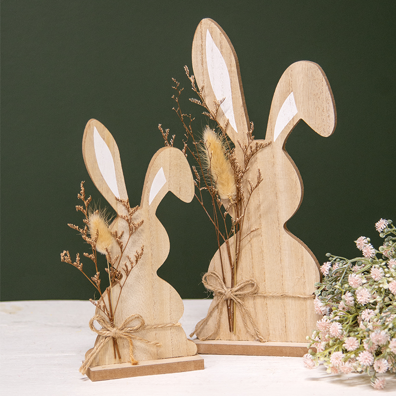 Textured design accents springtime farmhouse decor when this Wood Bunny with Foliage Sitter is on display. Made from wood and measuring 12" high by 5.5" wide by 1.5" deep, the sitter has the cutout shape of a sitting bunny silhouette and rests on a rectangular base. The bunny's ears have white painted centers, and one is shown standing tall while one bends down. A bow of jute twine tied around the bunny's body holds sprigs of brown and cream faux foliage for a unique touch.