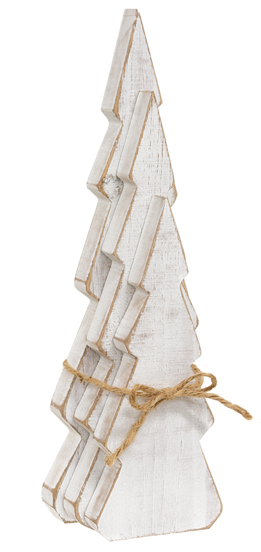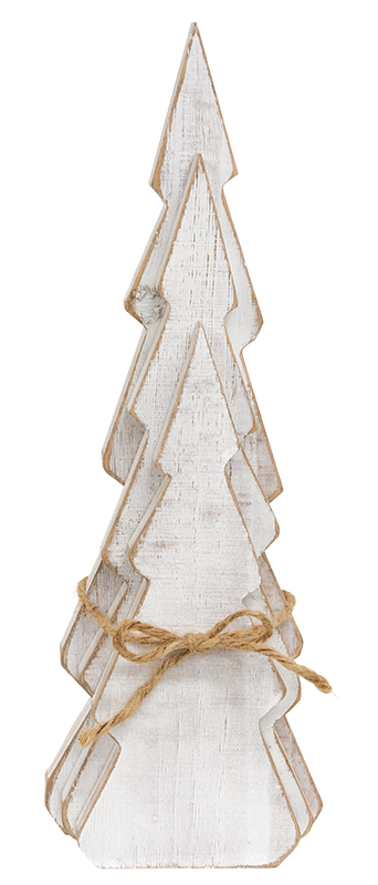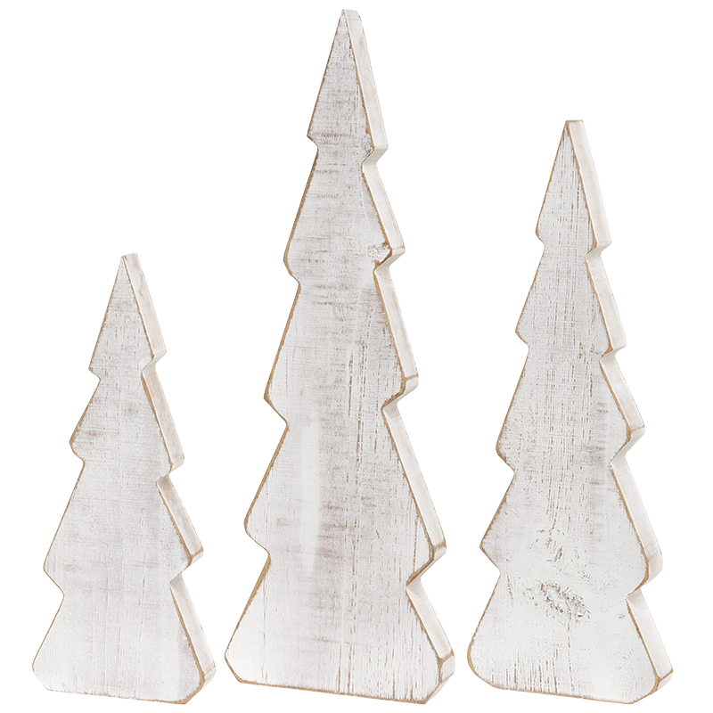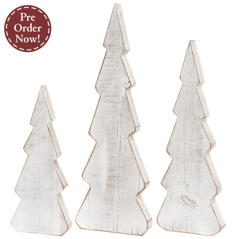 Our Rustic White Wooden Christmas Tree Sitters are beautiful tabletop trees that feature versatile winter design. These pine tree silhouettes are each painted white with a weathered woodgrain textured finish. Sold as a set of 3 with varying heights, the primitive-inspired trees come wrapped together with a jute twine bow. The tallest tree measures 13" high by 4.5" wide, the medium tree measures 11" high by 4" wide, and the shortest tree measures 8.5" high by 3.5" wide. Each measures 0.75" thick.