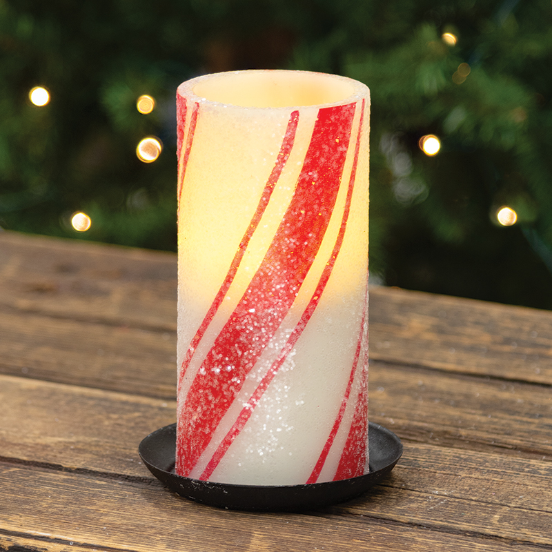 Our 6" tall Glittered Candy Cane Timer Pillar features a vintage red and ivory candy stripe design with a hand painted look. The surface is covered in transparent glitter which gives this candle a frosty and festive Christmas charm. The flame-shaped light has a warm flickering glow. Each electric candle is banded with a paper sleeve that includes product information and a bar code. 6" high by 2.75" diameter. Requires 3 AAA batteries. (not included)