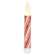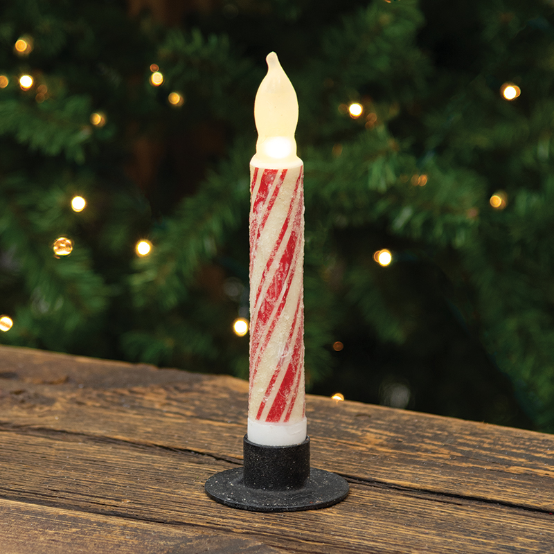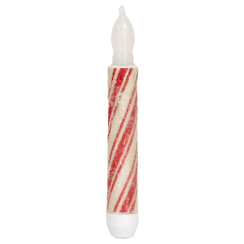 Our 6.5" tall Glittered Candy Cane Timer Taper features a vintage red and ivory candy stripe design with a hand painted look. The surface is covered in transparent glitter which gives this candle a frosty and festive Christmas charm. The flame-shaped light has a warm flickering glow. Each battery-operated candle is banded with a paper sleeve that includes product information and a bar code. Requires 2 AA batteries.