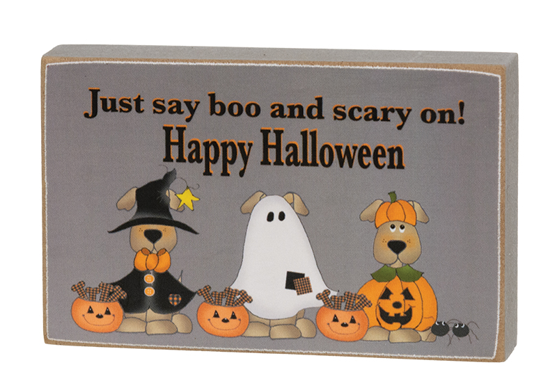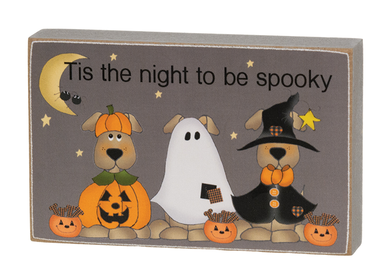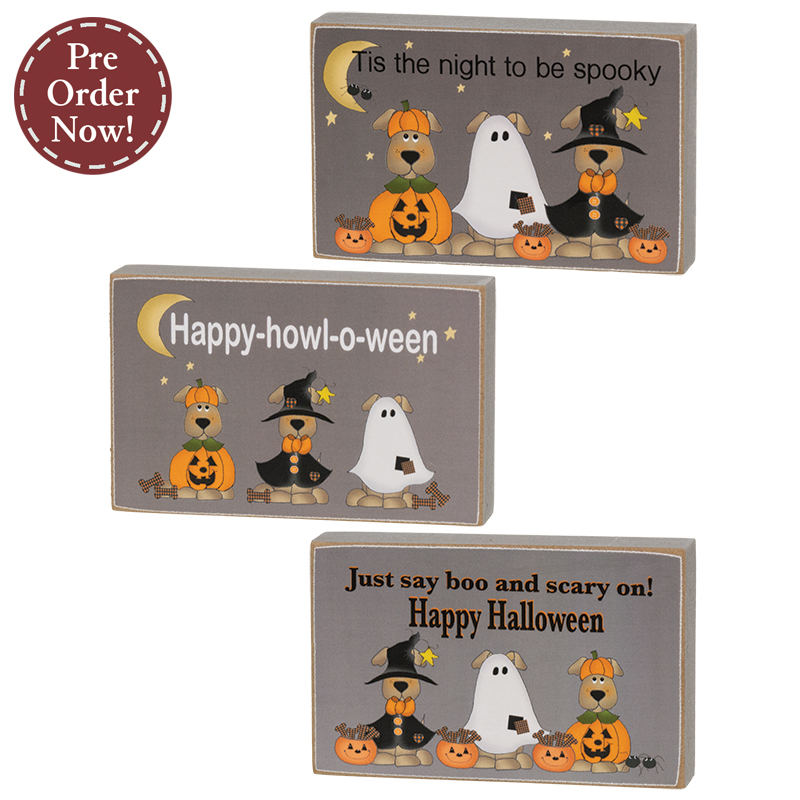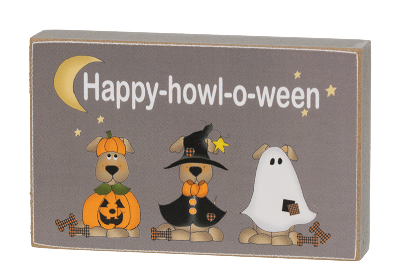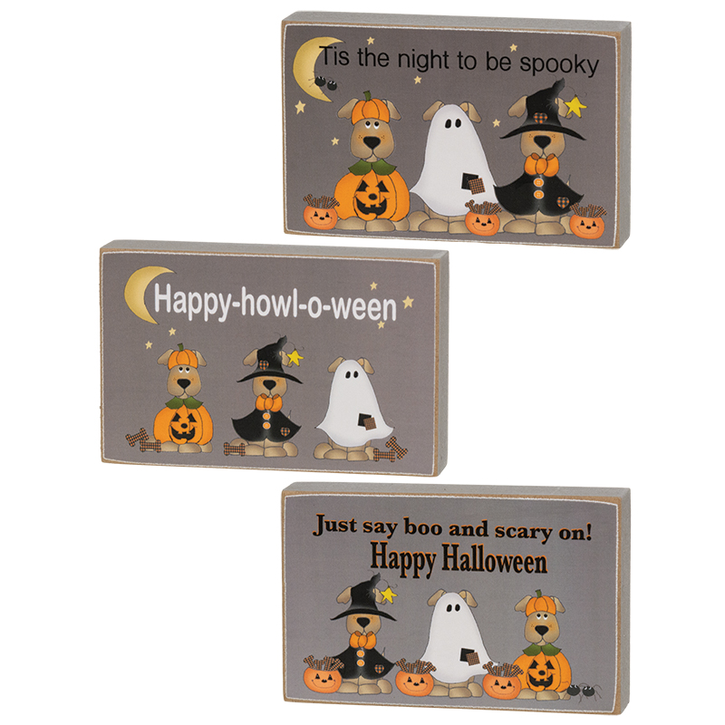 Our Happy Howl-O-Ween Rectangle Dog Blocks are an assortment festive wooden blocks that add pet-friendly charm to Halloween decor. Each feestanding mini sign has a gray background with lightly distressed edges for a rustic touch and features a trio of adorable light brown dogs dressed as a jack-o'-lantern, a witch, and a sheet ghost. Designs read, "'tis the night to be spooky," "happy-howl-o-ween," and "just say boo and scary on! Happy Halloween." Each block measures 2.5" high by 4" wide by .75" deep and makes a playful addition to shelves, mantels, or tabletop displays.