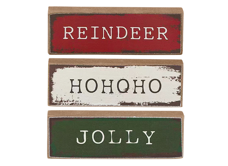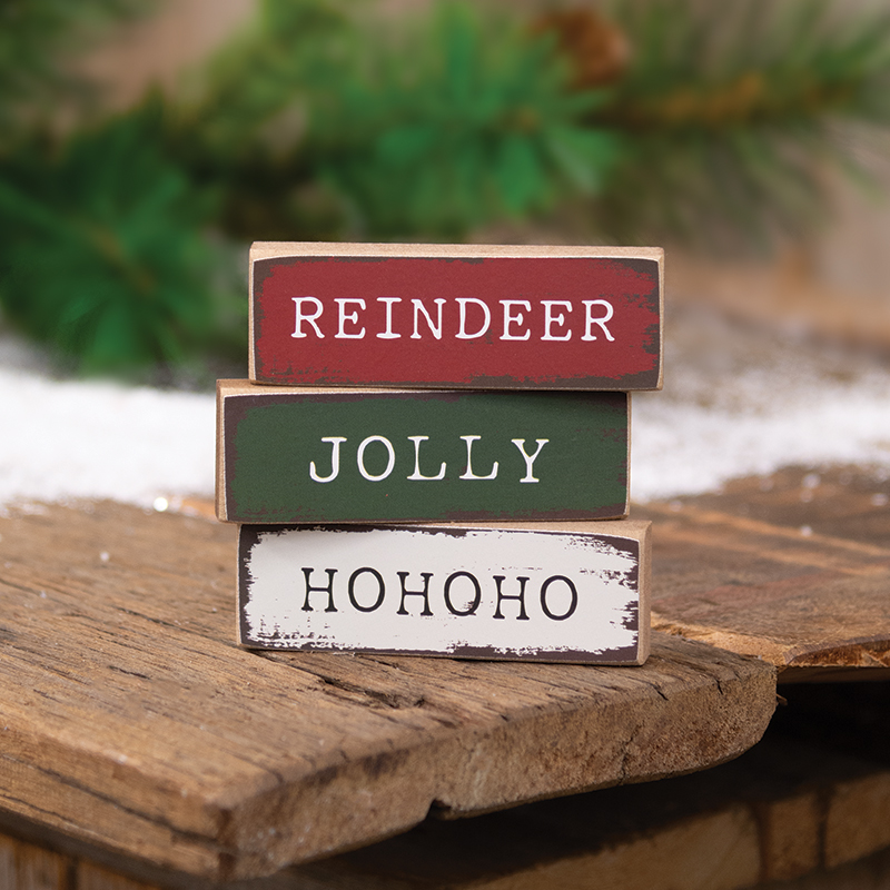This assortment of 3 tiny mini sticks have a distressed vintage look and feature the words: Reindeer, HoHoHo or Jolly. The sides are unpainted wood for rustic appeal. These petite wooden blocks are the perfect accent for displays of traditional farmhouse Christmas decor. Measures 1" high by 3" wide by 0.5" deep.