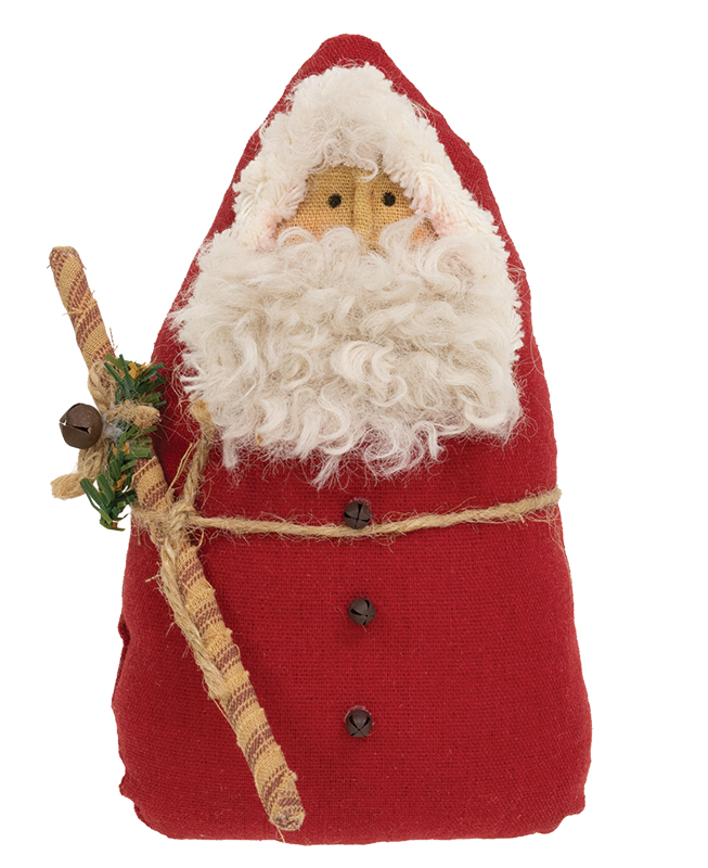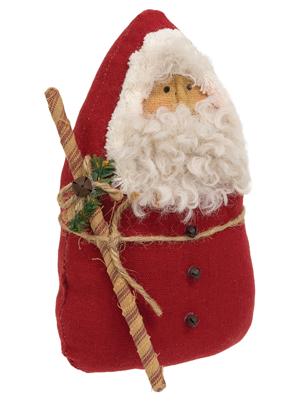 This primitive Santa Claus is a stuffed fabric figure with a Nordic style design. Perfect for collection of old-world Christmas decor, this freestanding doll has a vintage look with charming details including a stitched nose, brown jingle bells, and a twine band holding a rustic ticking-striped candy cane. Has a weighted bottom and meaures 7.5" high by 4.5" wide by 3" deep.