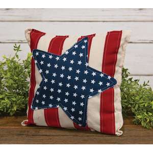 Our Patriotic Flag Pillow has visible stitching and raw edges for a classic, hand-pieced look. It's a great staple for a farmhouse Americana collection. This stuffed fabric pillow is 11.25" high by 13.25" long by 3.25" deep.