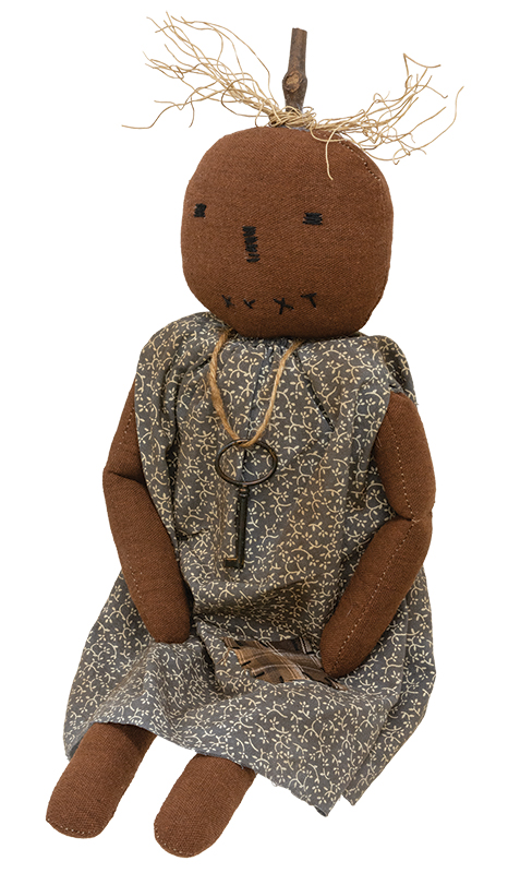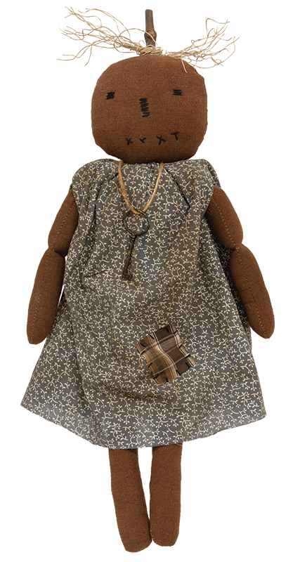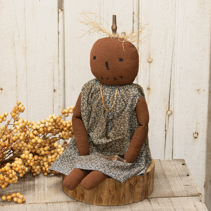 Bring primitive style to rustic fall displays with this stuffed fabric pumpkin girl doll. This unique Halloween doll features an antique-style key necklace, stitched facial features, and hair made of dried vines. Her dusty blue dress lends a hint of homespun charm with a tiny cream floral pattern and a grungy vintage finish. Measures 19" high by 8" wide by 2.5" deep.