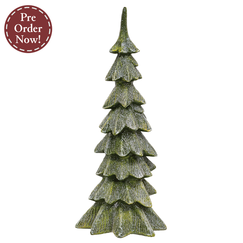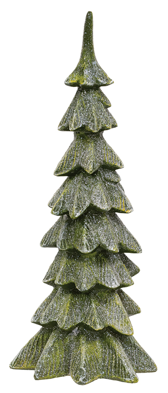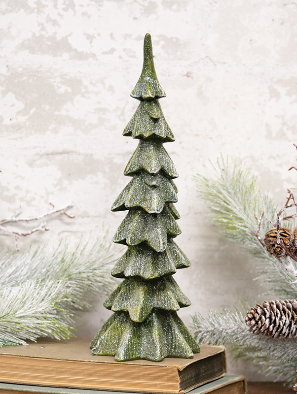 Our 10" tall Resin Glittered Christmas Tree has a hand sculpted look that's painted in shades of green with a coating of glitter for a frosted winter touch. This pine tree figurine is a timeless accent piece that's perfect for creating a charming seasonal tabletop scene, enhancing a Christmas village display, or layering with shelf decor. Stands 10" tall by 4.25" by 3.5" deep.
