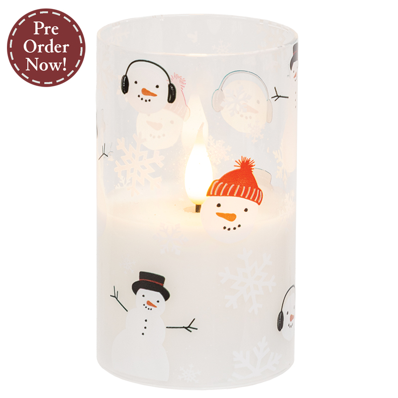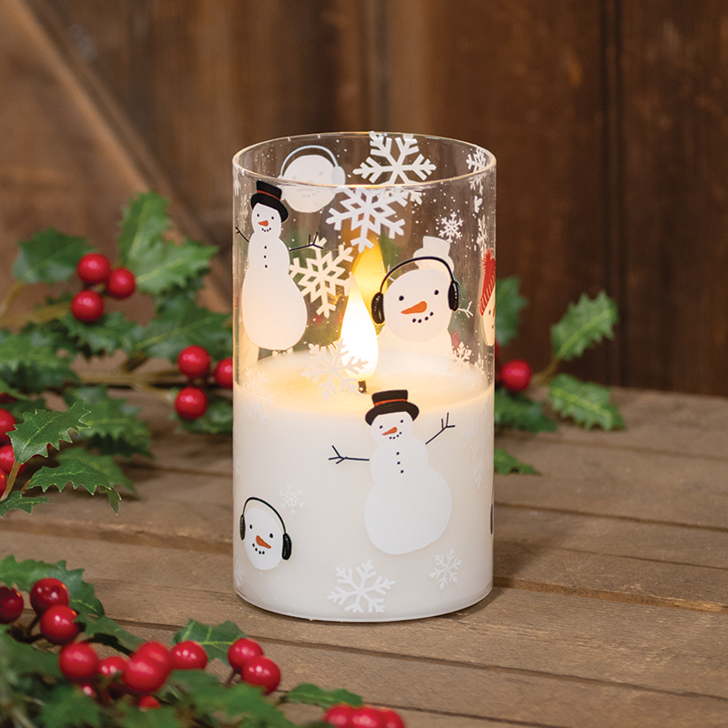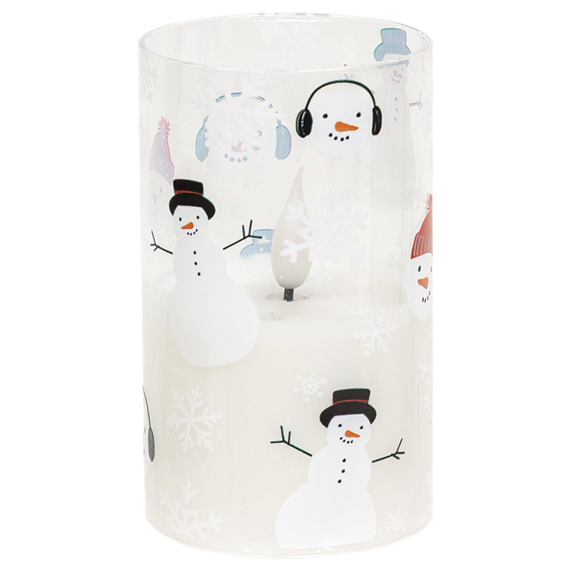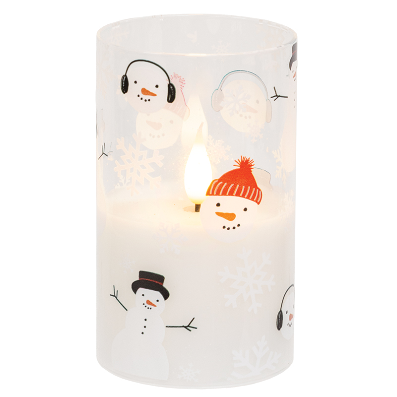 Our 5" Scattered Snowman & Snowflake Glass Timer Pillar features a flurry of snowflakes mixed with snowmen who are wearing red beanies, earmuffs, or top hats. This battery-operated timer candle is made of wax and enclosed within printed glass. The flame-shaped light has a warm glow with a subtle, realistic flicker. This unique ighting accent is ideal for cheerful winter decorating. 5" high by 3" diameter. Requires 2 AA batteries (not included).